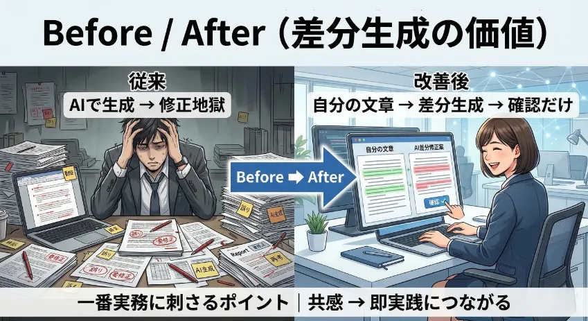 「変更点を見せる」設計にすることで、確認コストが激減する。いけともch「ChatGPT時短術10選」でも同様のアプローチが実演されており、メール文面・報告書の効率化に特に有効だ。